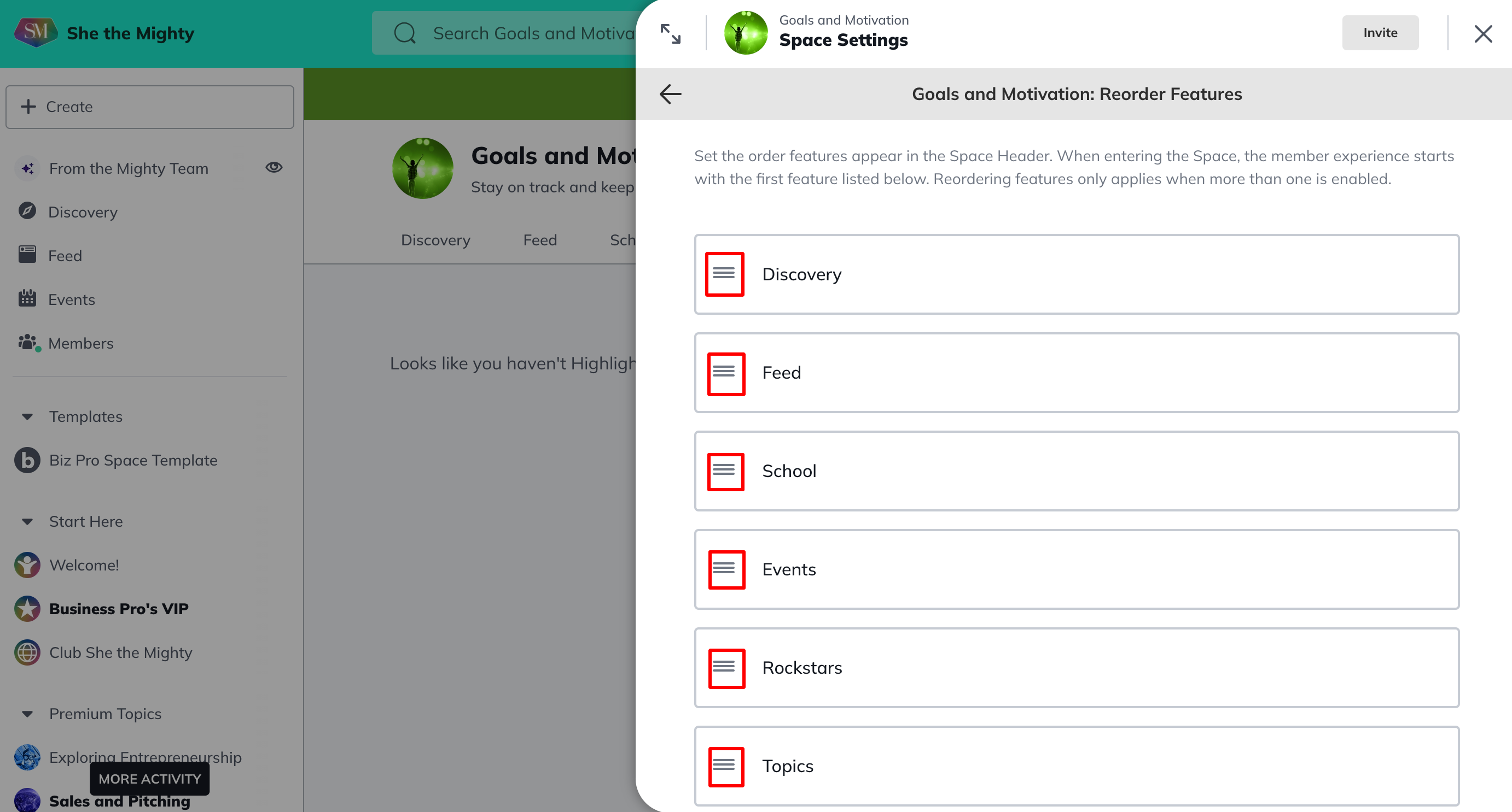Once you’ve opened it, you can reorder your Space Features by dragging and dropping them using the three line controls to their left. It’s important to note that you can nor edit the names of each feature in this section, you do that inside of the Manage Feature section in each Feature.