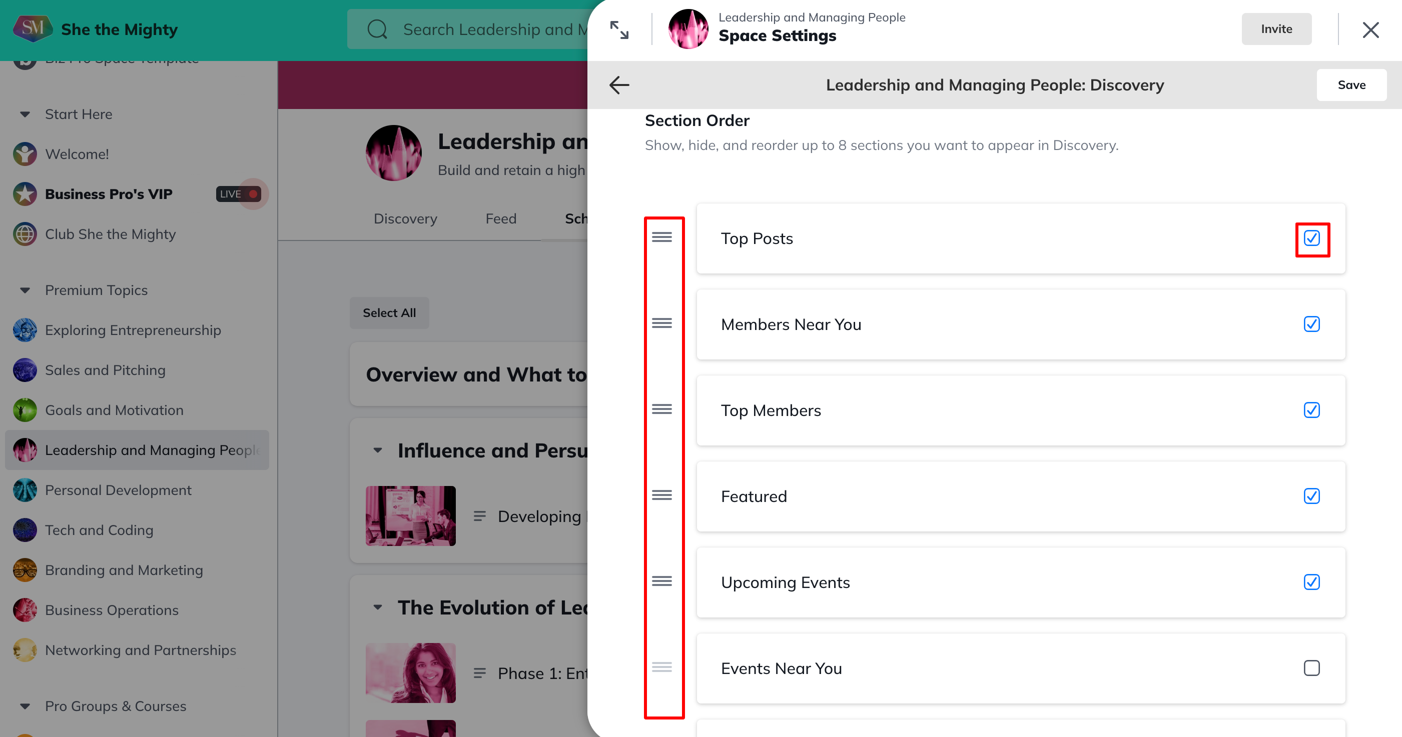 Discovery: Is a visual display for the Space to highlight key content, members, and more. With Discovery, you can show, hide or reorder (by dragging and dropping) up to 8 sections that you want to appear.