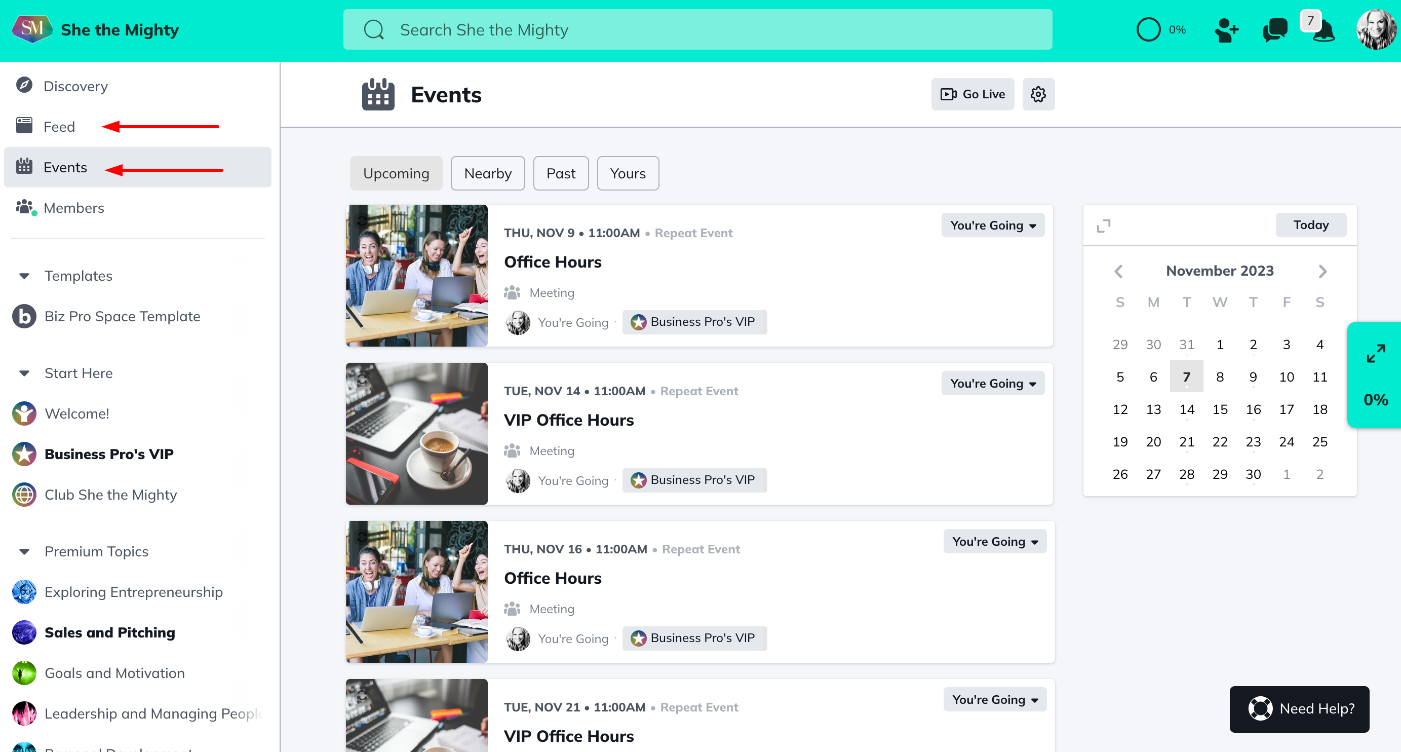 Events: You can activate Events in your Spaces that include RSVPs, and messaging. Events in a Space will appear in the Feed feature, if it’s enabled, and will appear in the Global Feed (only to members that have access to the Space the event is in, or if it’s a public event in any Space).