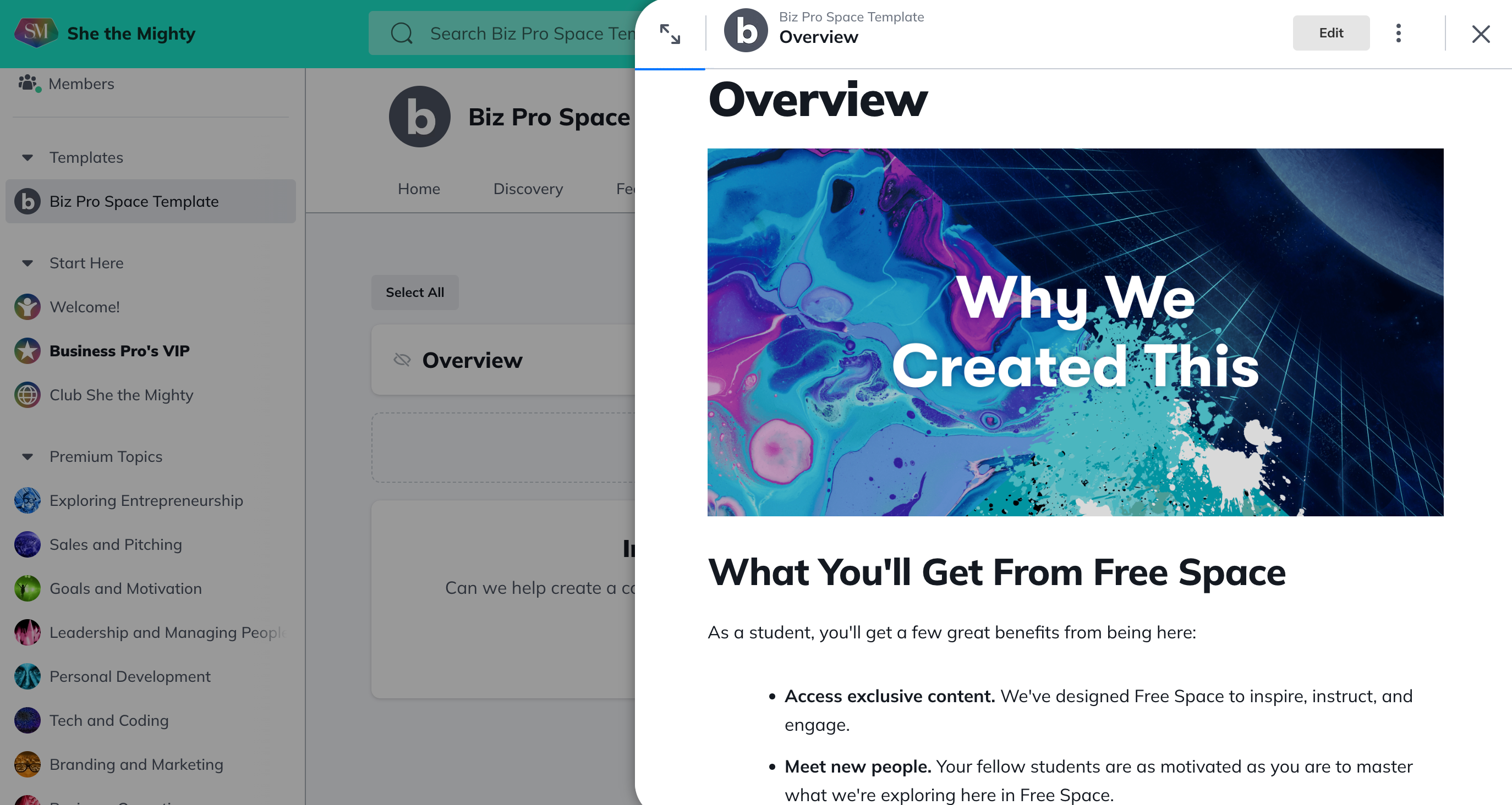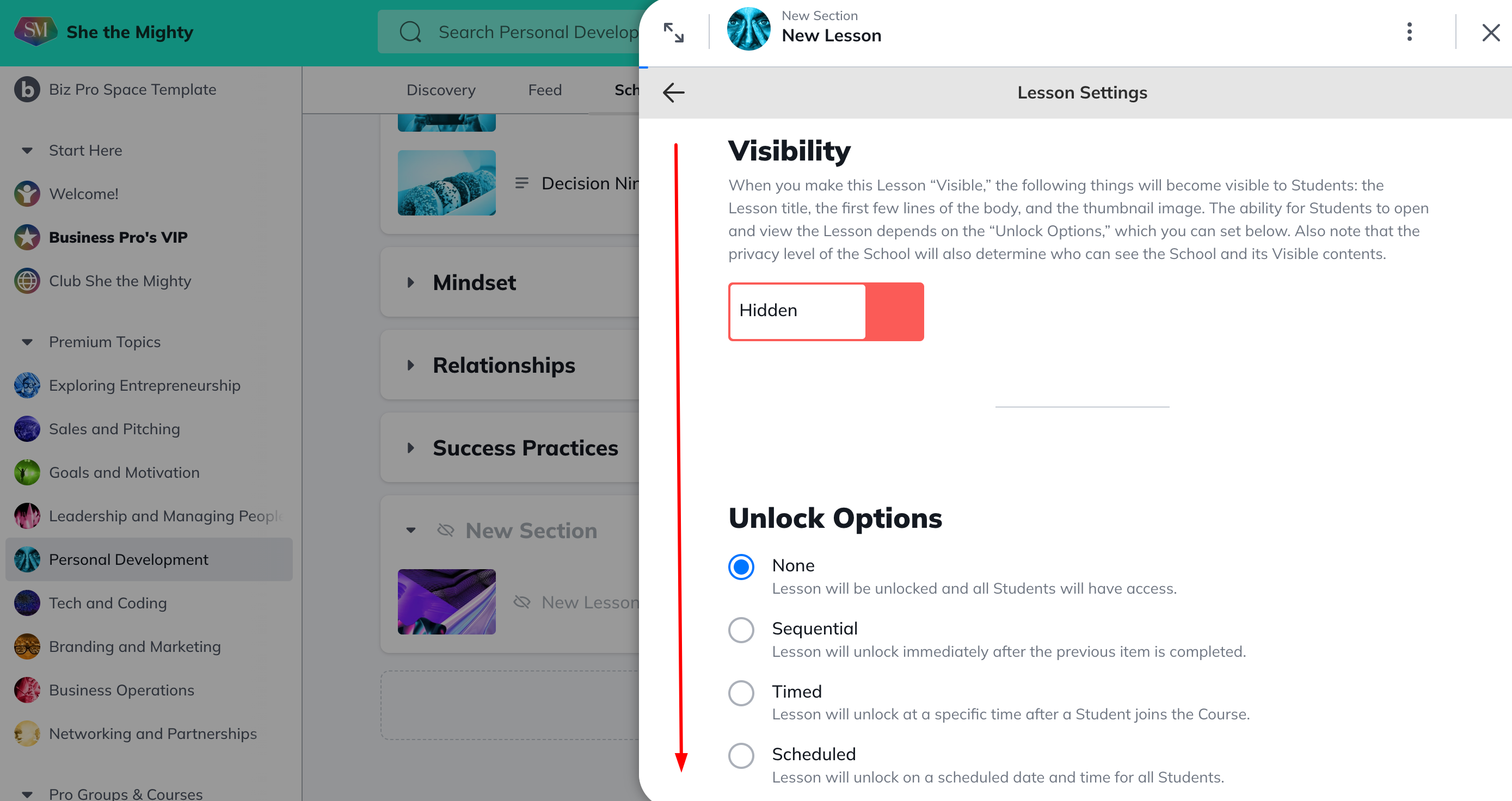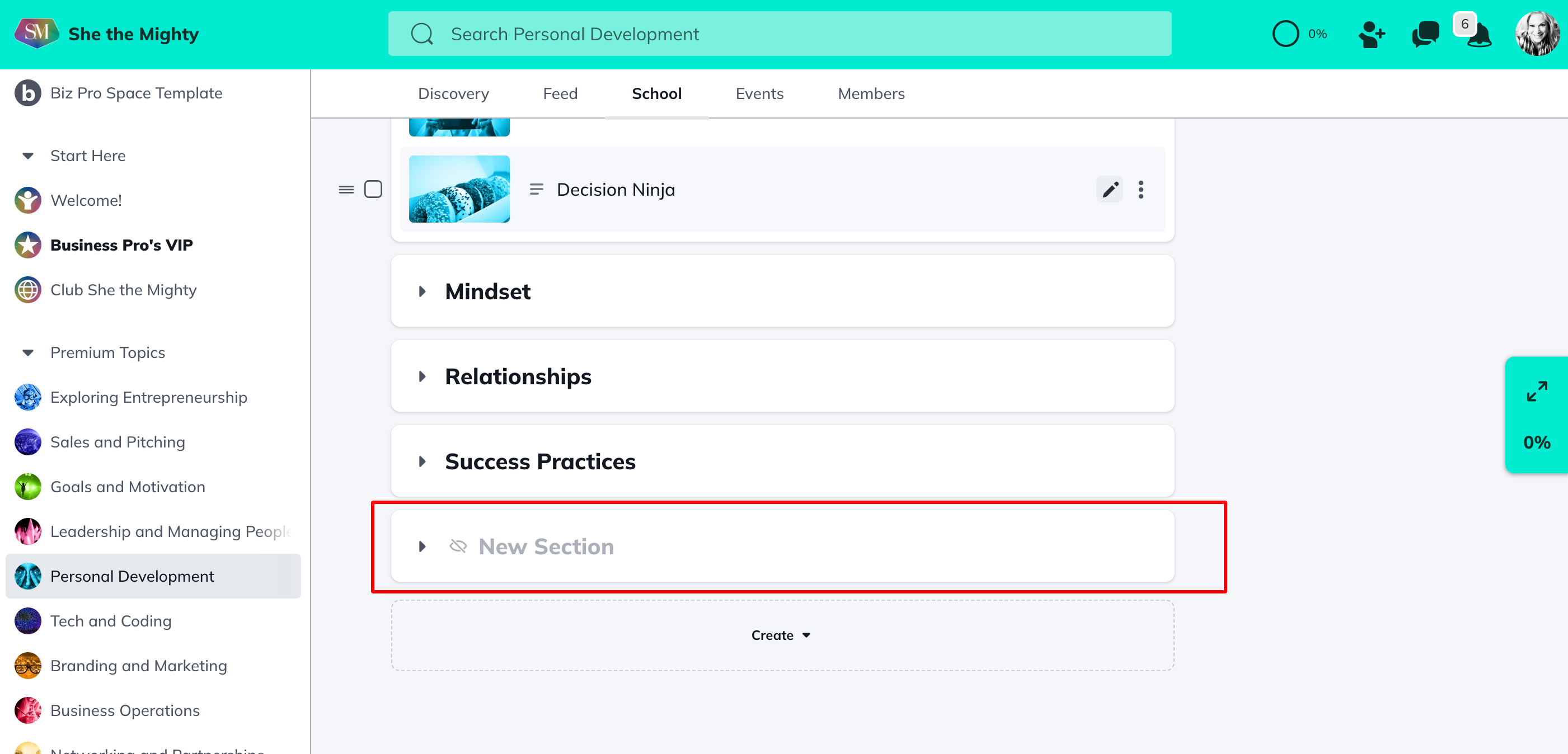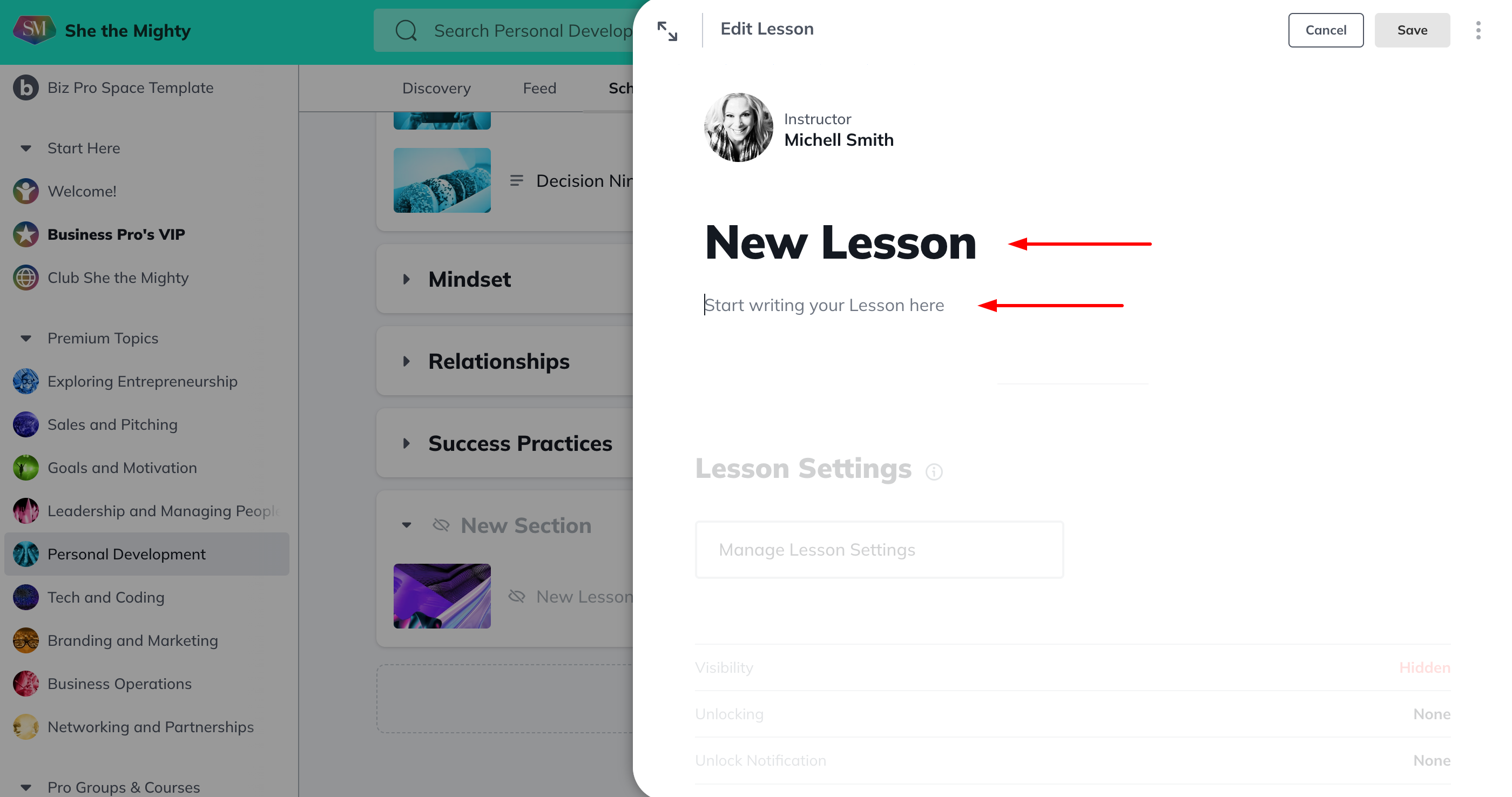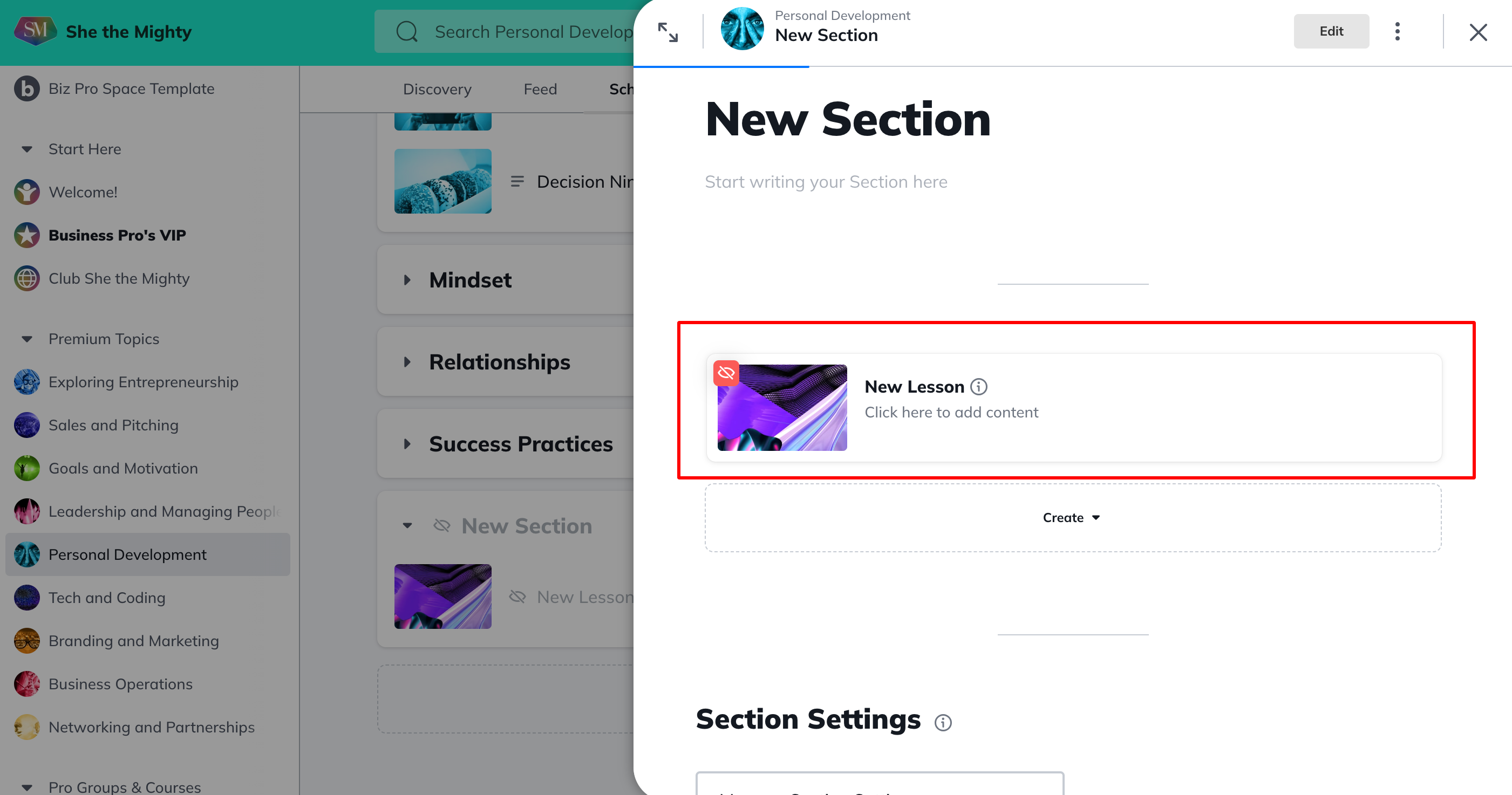 Lessons can stand alone or be organized into Sections. You can create up to 500 Sections and/or Lessons within each Space you create in She the Mighty.