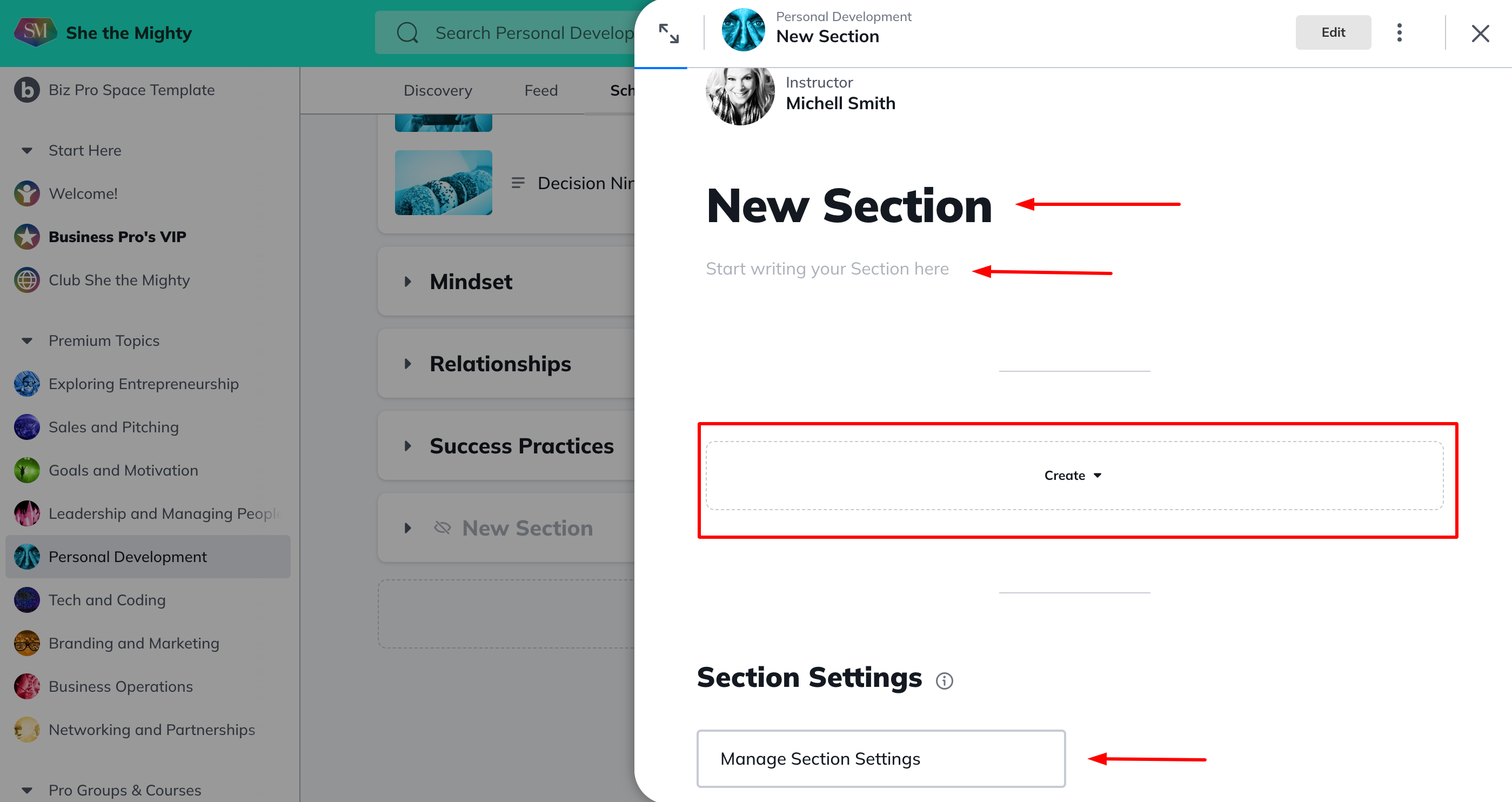 To edit your Section, click into the Section bar first and you will see a content editor pop up on the right of your screen. Edit the Section Title and Section Overview here. You can edit more options of the Section in the Manage Section window at the bottom of the editor. When you are ready to add a Lesson to this Section you can click on the Create button in the same editor.