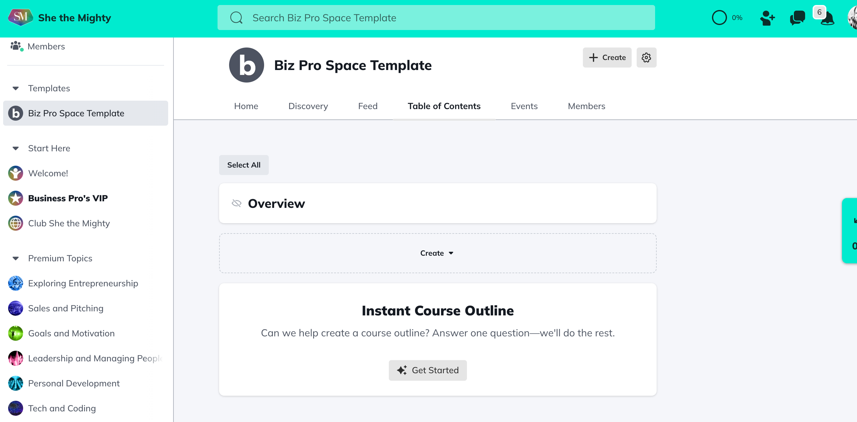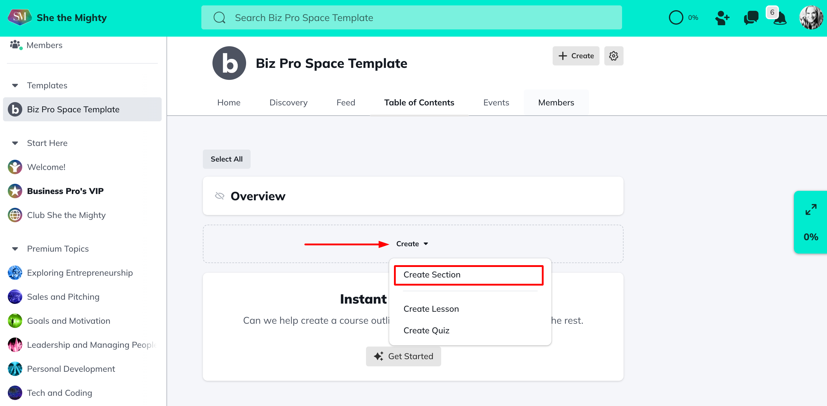 Sections allow you to break up your content and organize similar materials in one place. Each Section serves as the mini overview for a specific part, and each section contains Lessons. You can create up to 500 Sections and/or Lessons within each Table of Contents feature you create in each of your Spaces on She the Mighty.