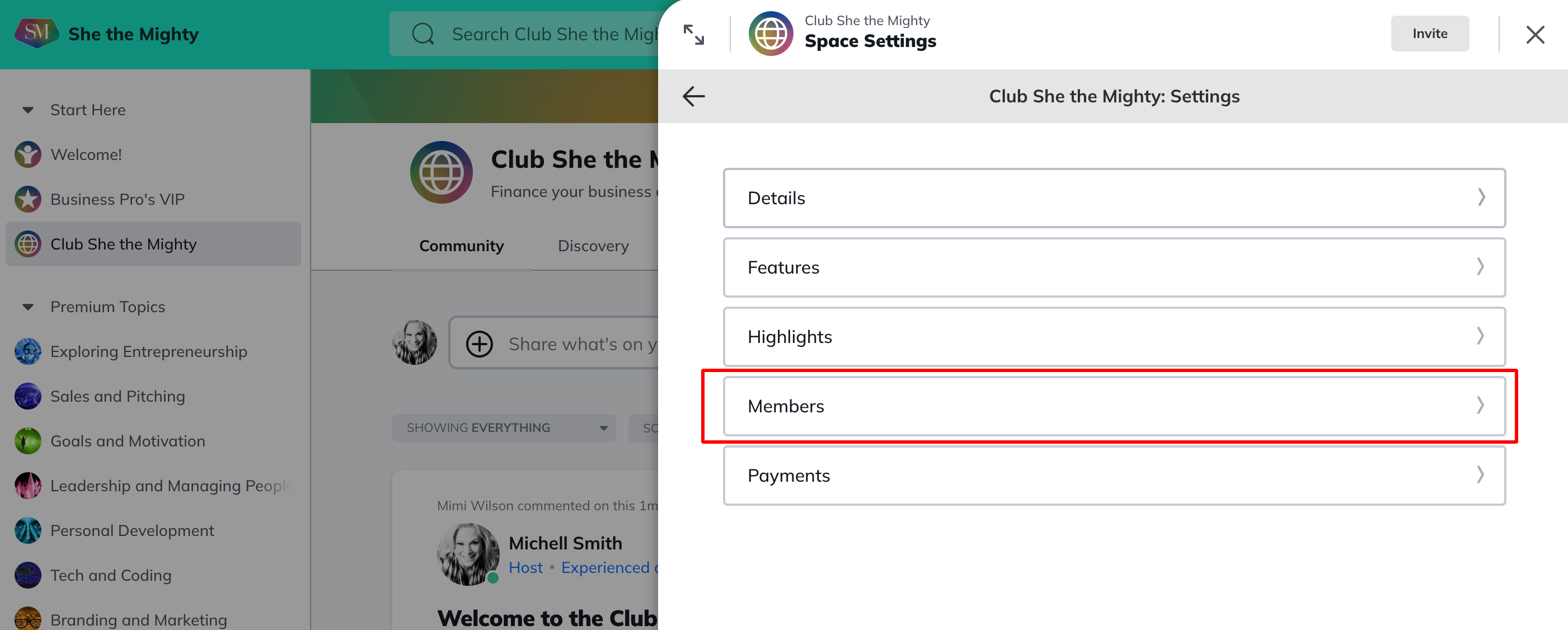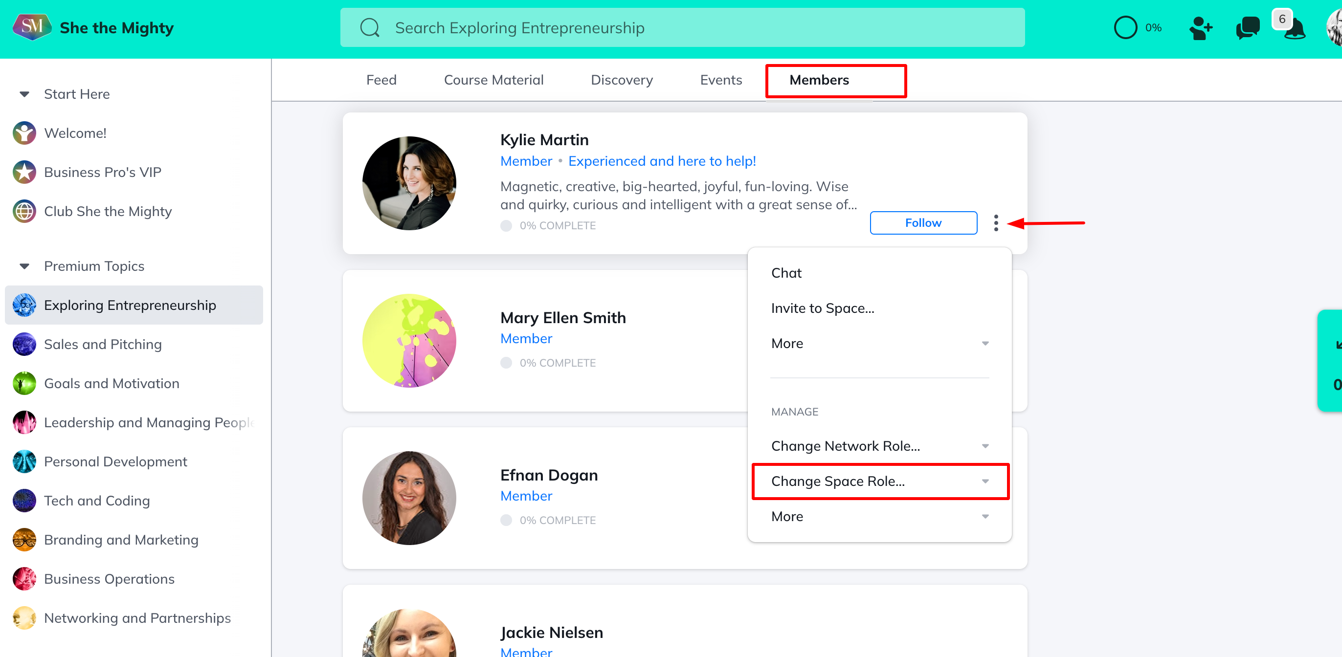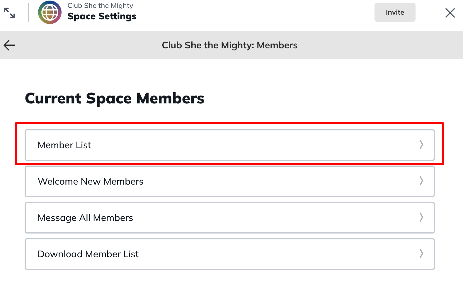 If you don’t have a member list enabled in a Space, you can find the members by going to the gear icon > Members > Member List and selecting the three dot menu to the far right of the member you’d like to assign a new role to.