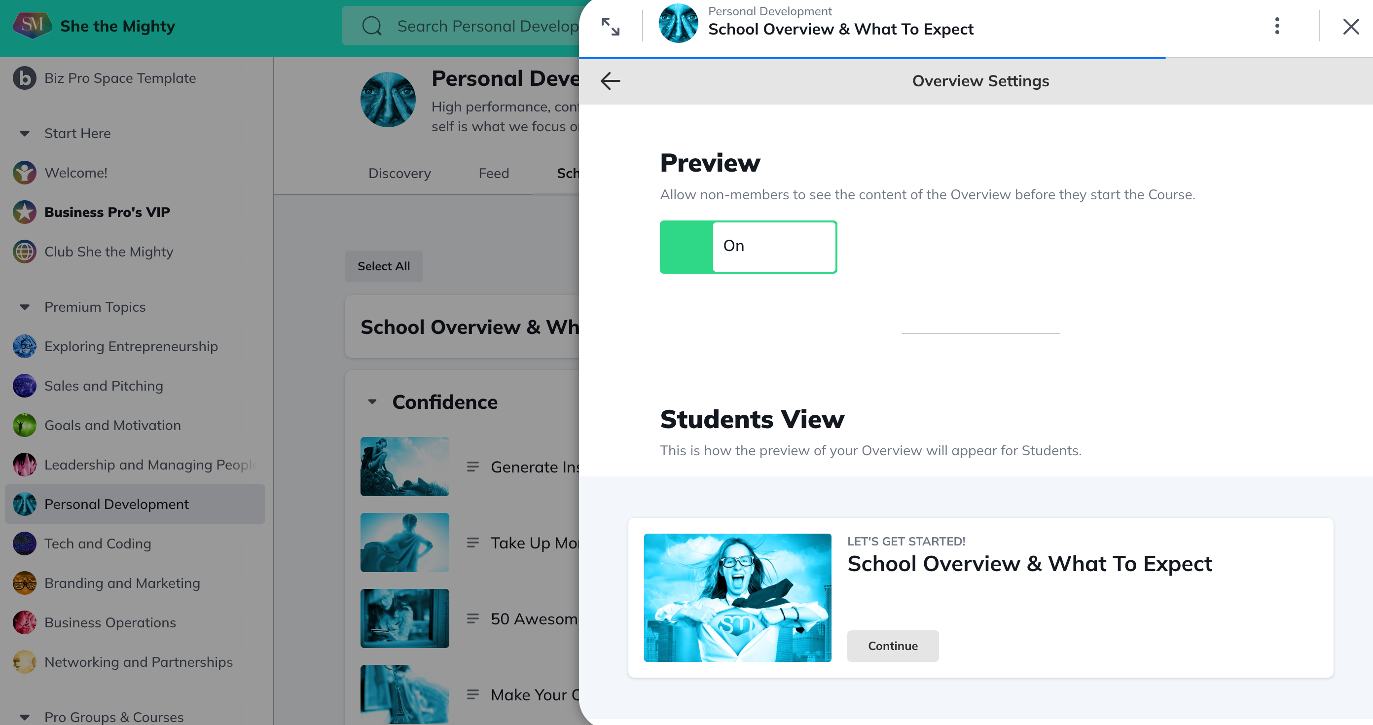 For your Overview, as well as any Lesson or Section, you can see whether the page is visible or hidden, whether the thumbnail image is the default or one you’ve customized, and whether you are enabling previewing. To change these settings, choose Manage Overview Settings.