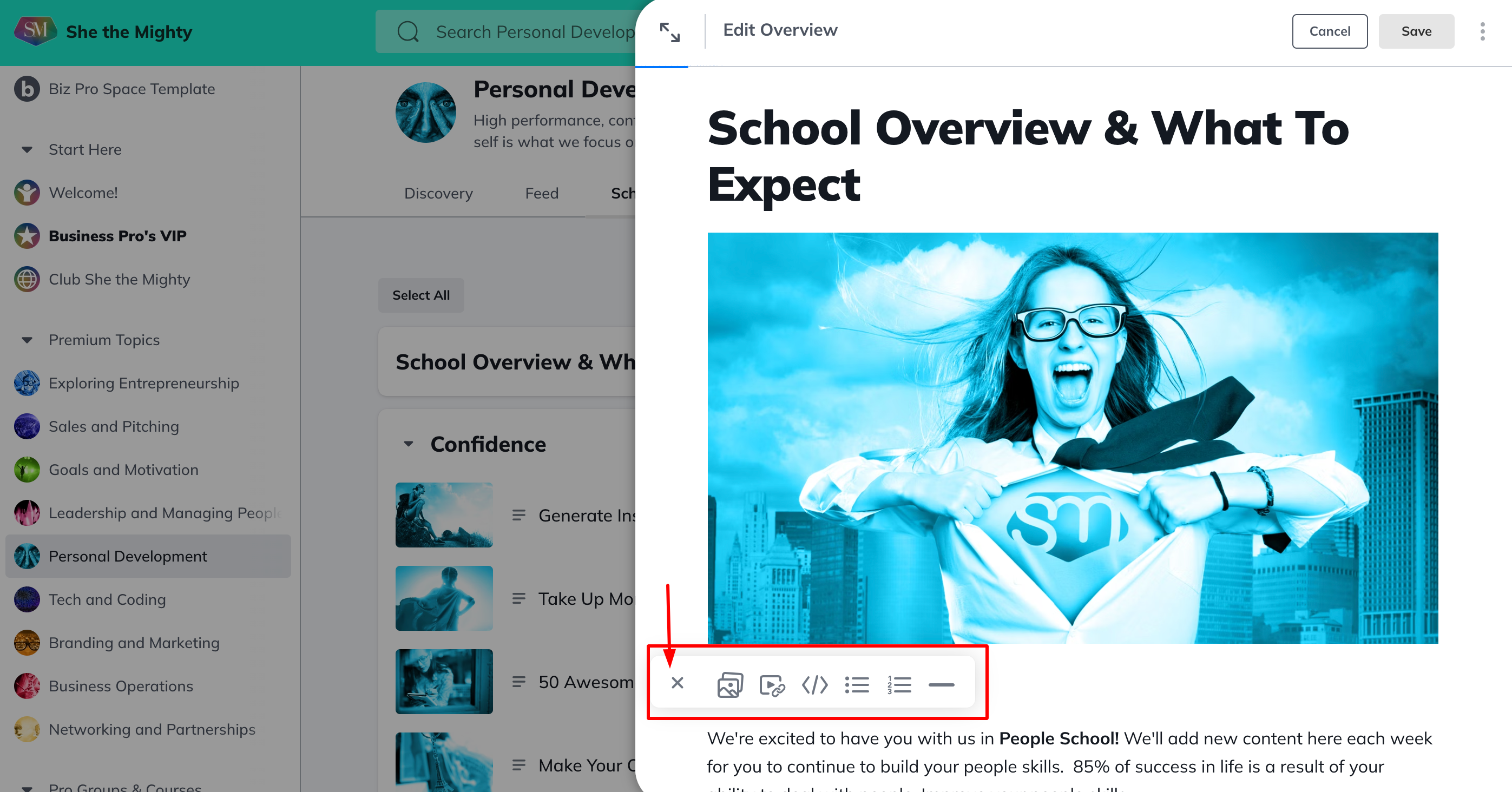 The Overview has the same features as an Article on She the Mighty. You can add a video, photos, and files.